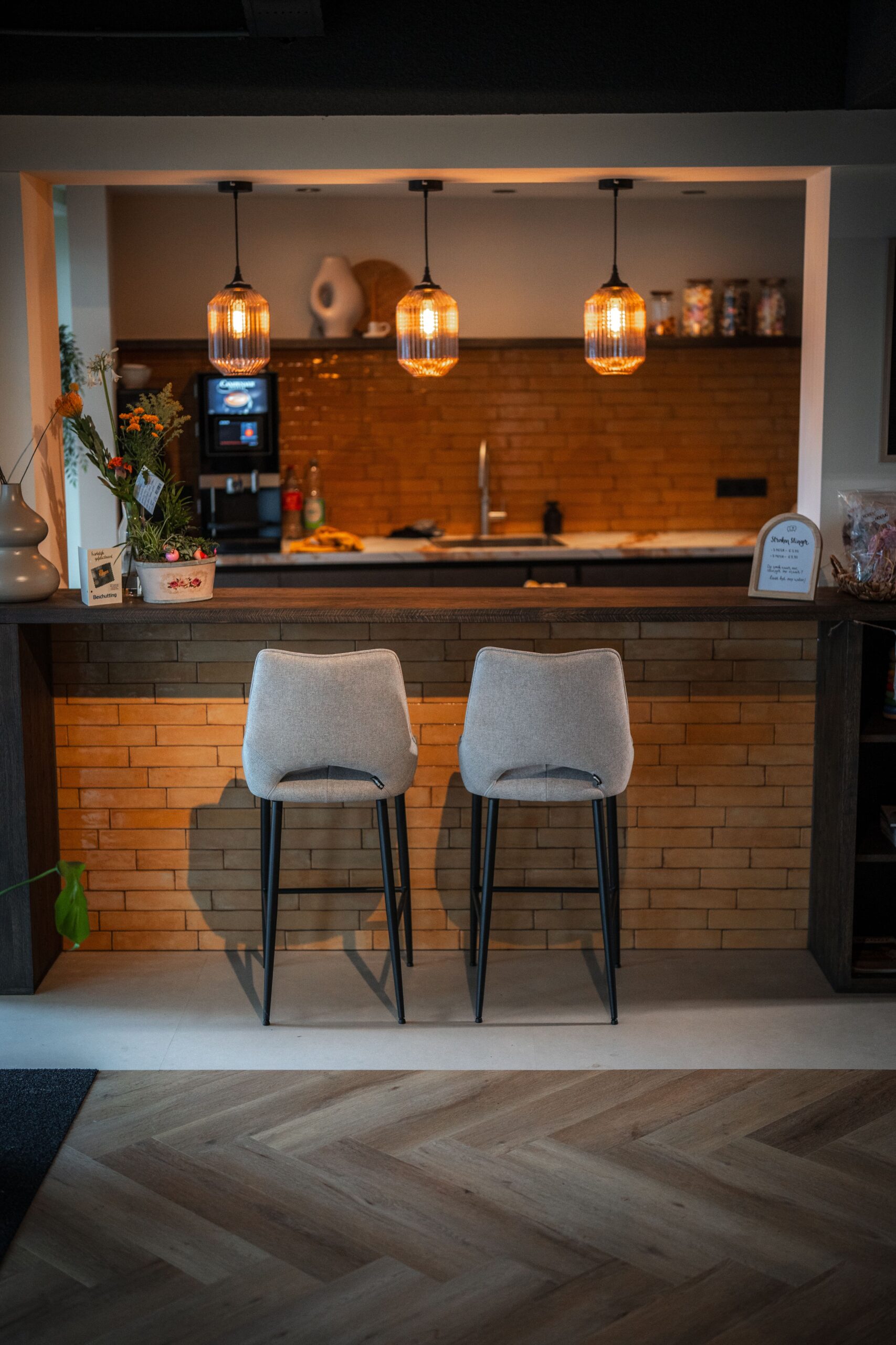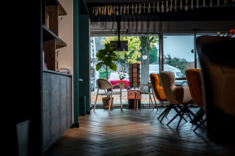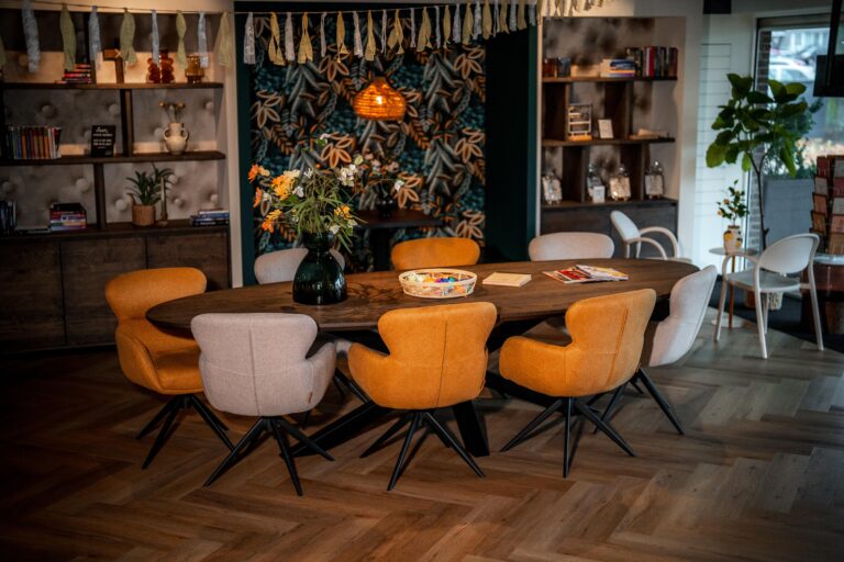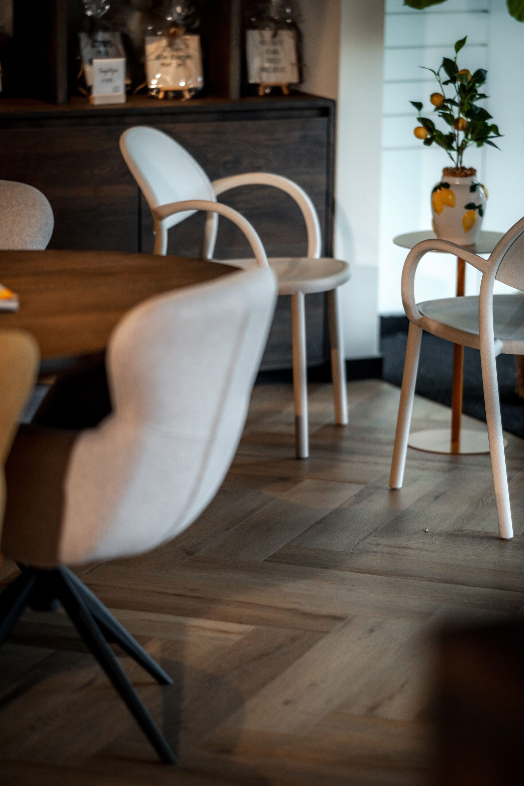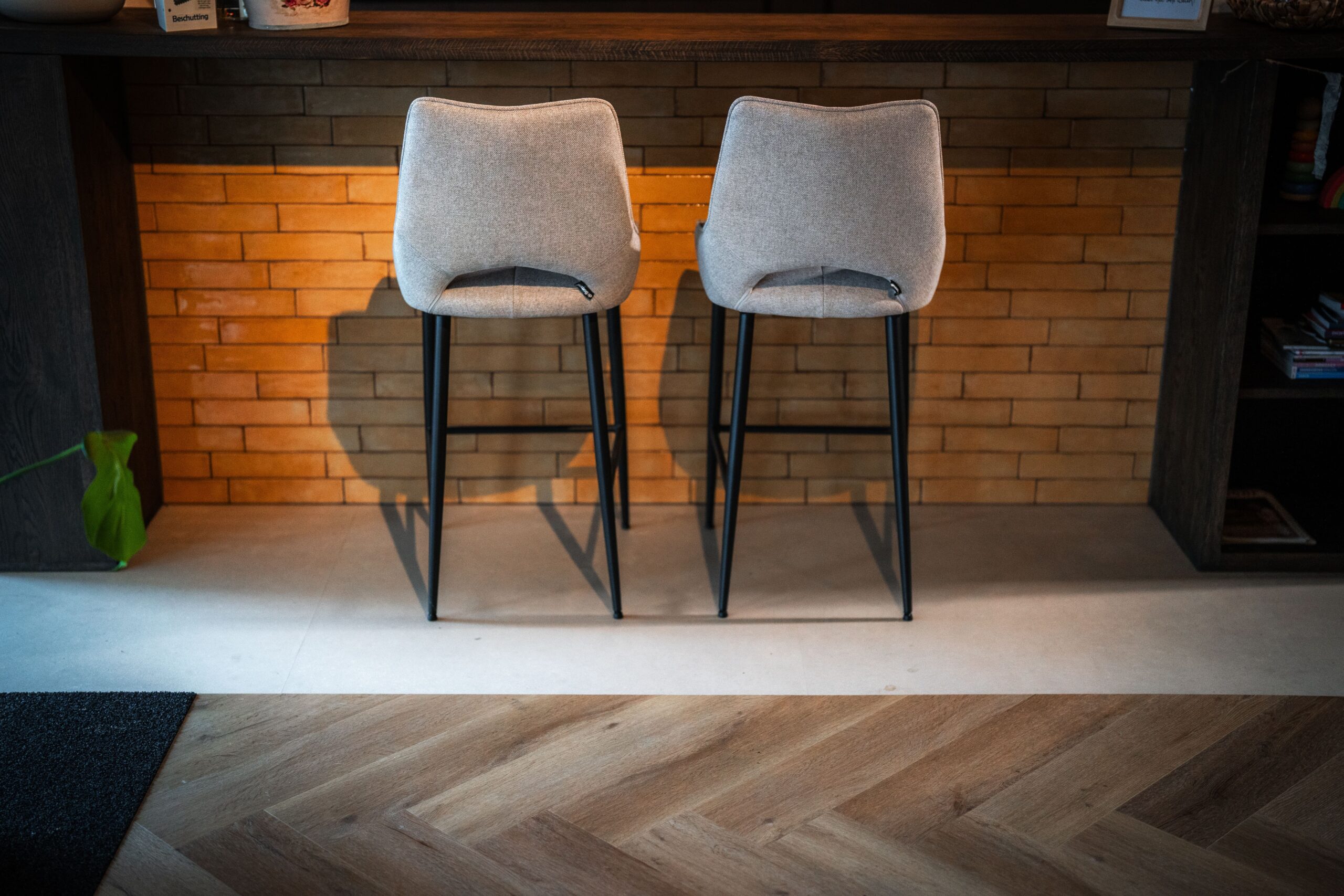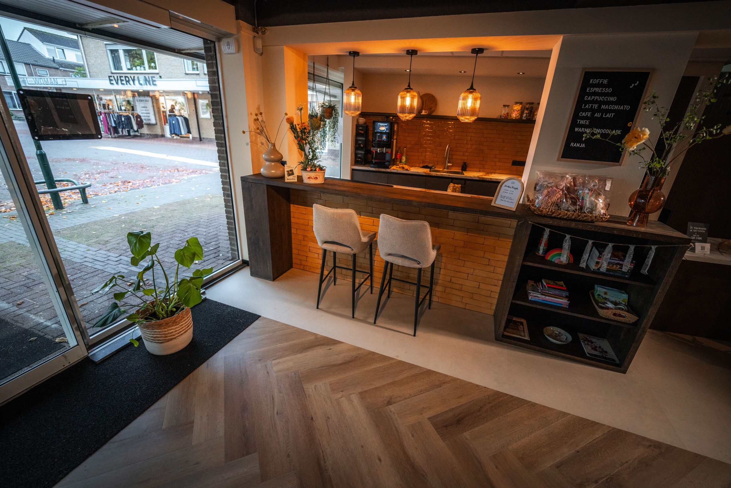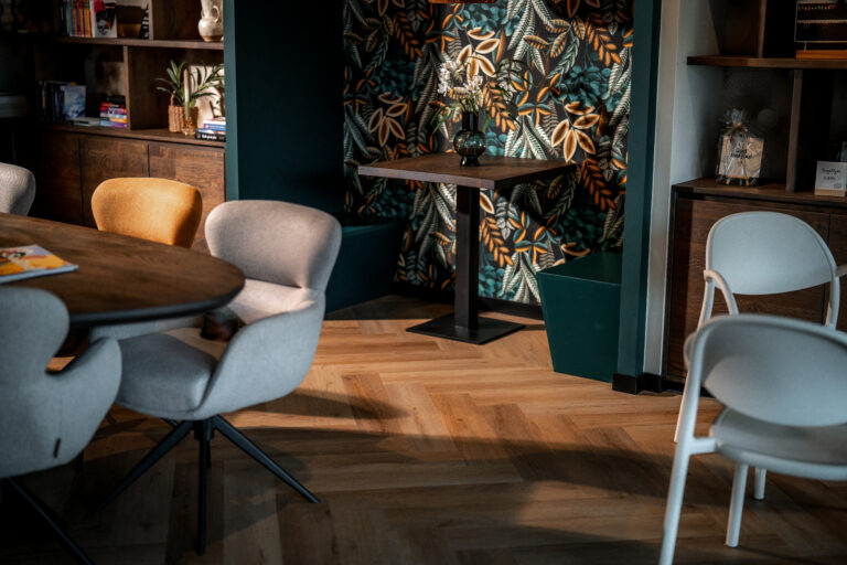 In de ontmoetingsruimte hebben we een PVC-vloer in visgraat motief gelegd, wat de ruimte een luxe en warme uitstraling geeft. Het patroon zorgt voor een speels, maar toch chique effect, perfect passend bij de gezellige en uitnodigende sfeer van Beschutting.