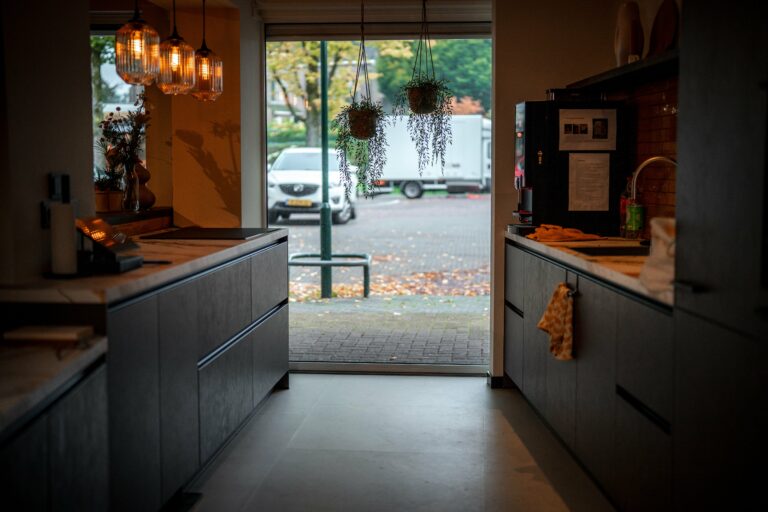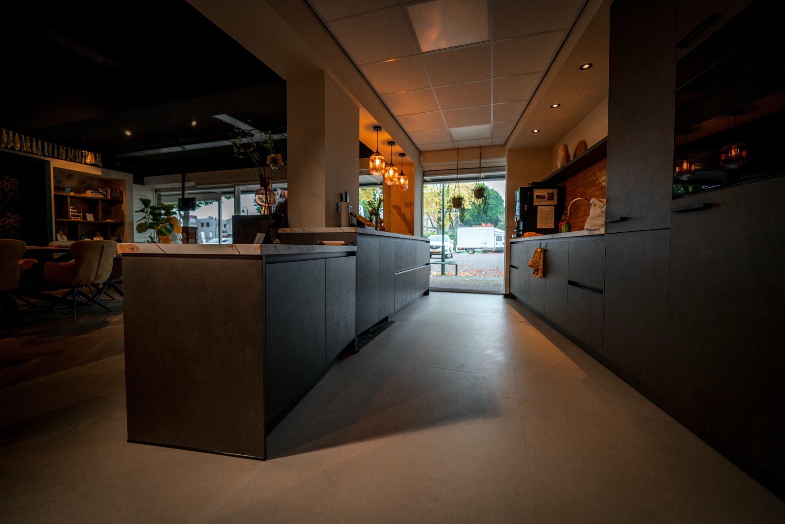 De vloer is afgewerkt met bijpassende plinten en voorzien van een schoonloopmat bij de entree, zodat de ruimte zowel stijlvol als praktisch blijft.